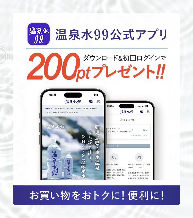 温泉水99は、鹿児島県垂水温泉から湧き出す天然水です。