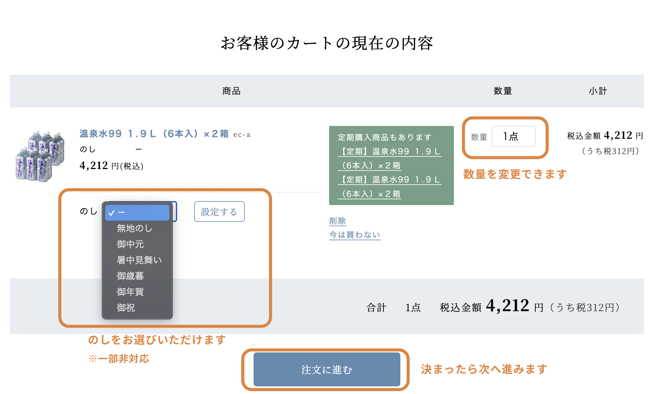 ご注文が正常に完了すると、ご登録のメールアドレス宛に「【温泉水99】ご注文内容が登録されました」のメールが届きますので、ご注文内容をご確認ください。
