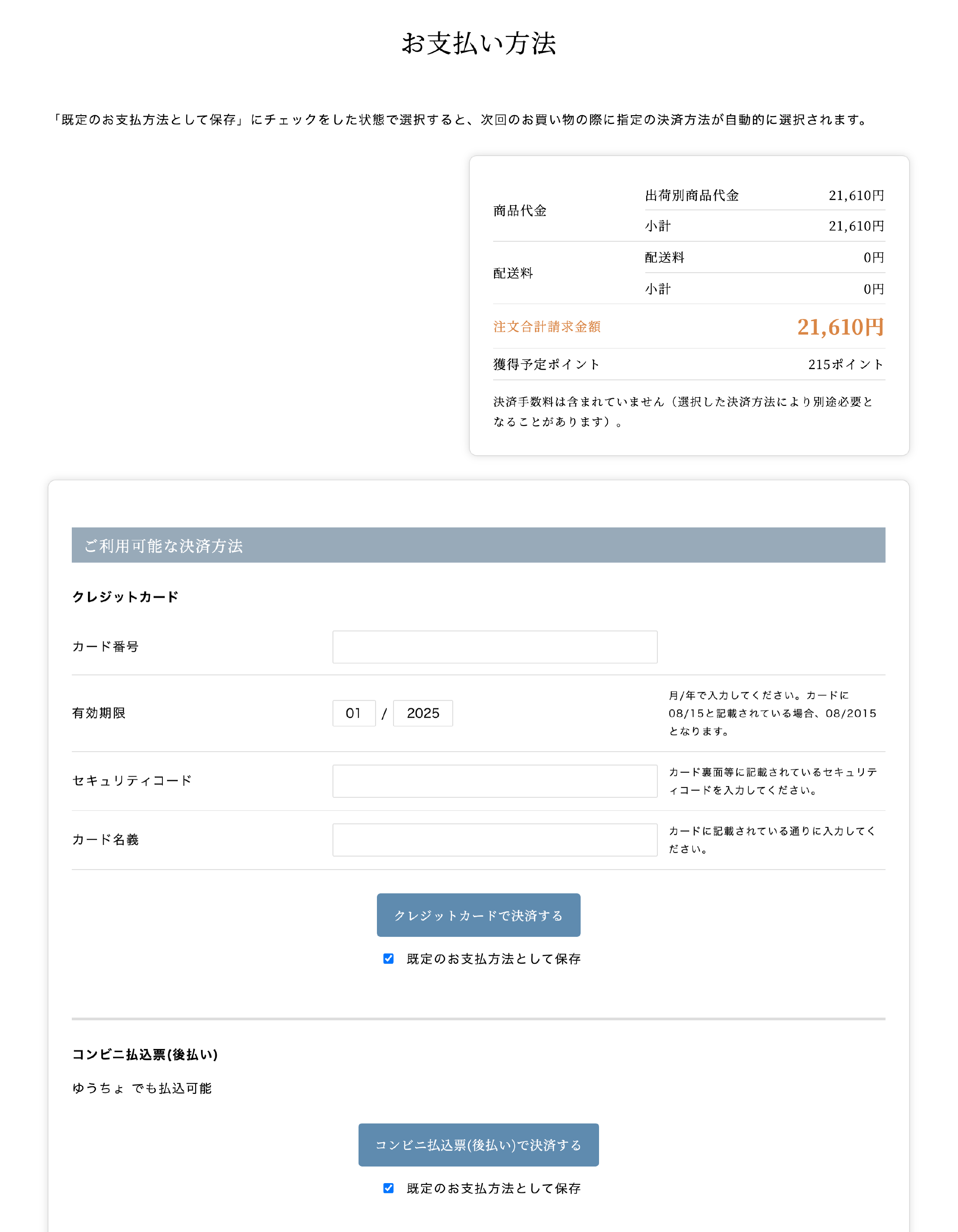 ![]() お支払い方法のクレジットカード決済にお客様のカード情報をご入力ください。 幣社にてご注文を確認後、「ご注文ありがとうございます」メールをお送りします。 金額の引き落としは商品の出荷日とさせていただきます。 |