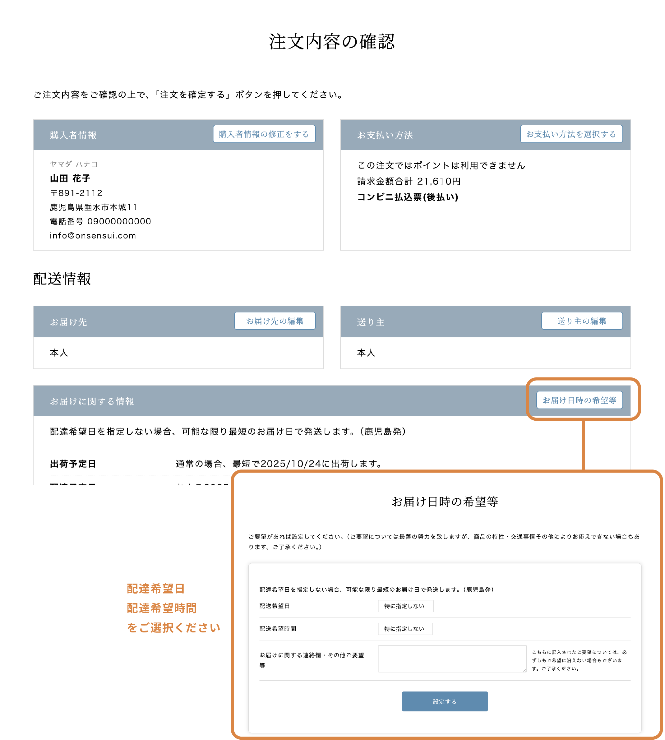 お届け日は5日・10日・15日・20日・25日から選択可能。時間指定も可能・午前中・14〜16時・16〜18時・18〜20時・19〜21時