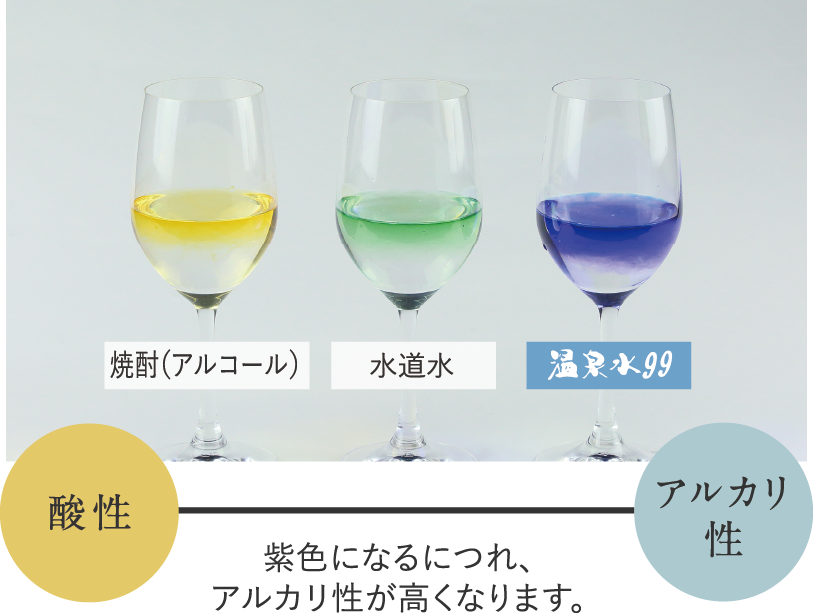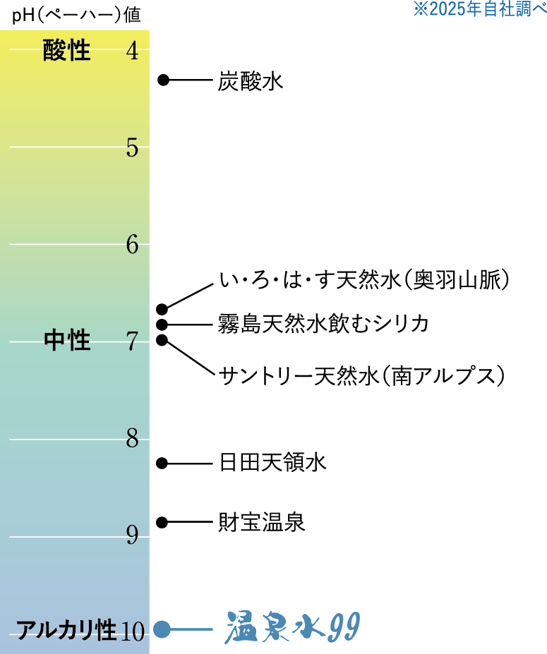 市販されている多くのミネラルウォーターはpH7前後の「中性」に近い水です。しかし、温泉水99はpH9.9という“圧倒的なアルカリ性”。