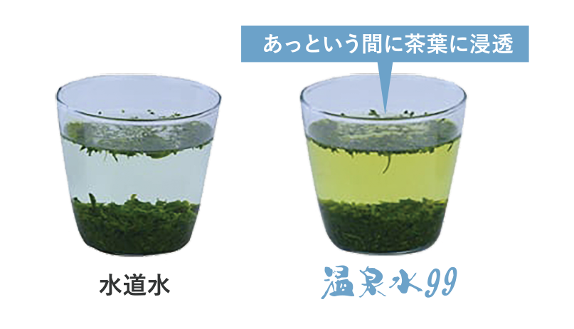 常温(お湯ではありません)の水道水と温泉水99に同時にお茶の葉を入れてみました。温泉水99の浸透力の高さは一目瞭然です。