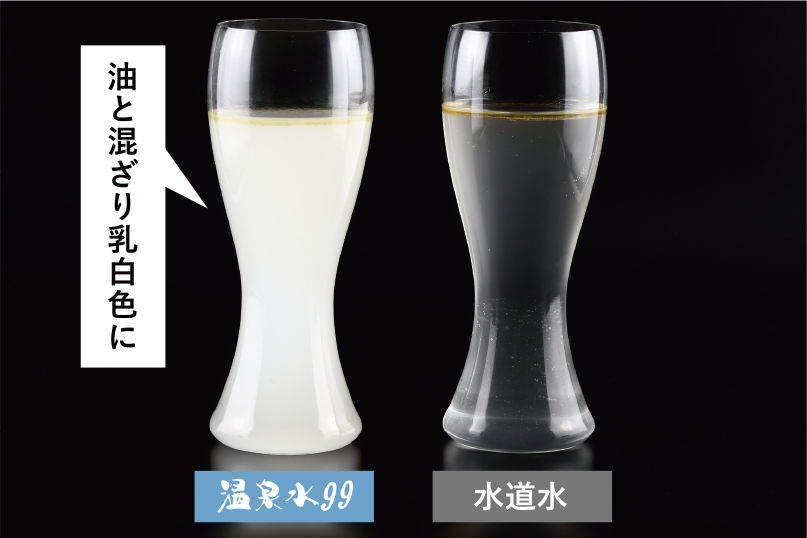 サラダ油を使った実験で、温泉水99は、撹拌後(かき混ぜる)5分経過時点で、水道水の2.23倍多くサラダ油を溶かしたという測定結果があります。