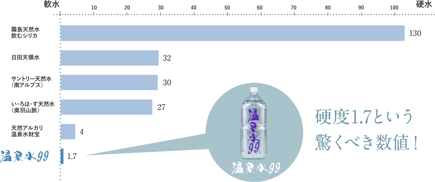 温泉水99は、硬度1.7mg/Lという驚異的な超軟水。
