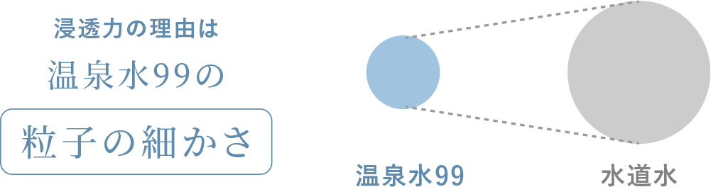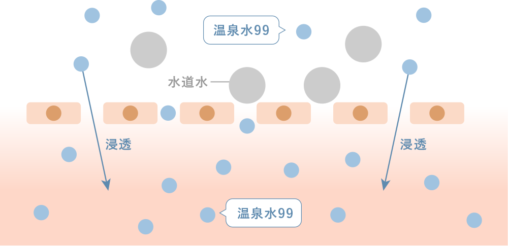 「温泉水99」は水道水よりも粒子が細かいため、細胞内に浸透し易くなっています。細胞内に入った水分は尿や汗となり、古い水分と共に塩分や老廃物、毒素を体外へ 排出します。